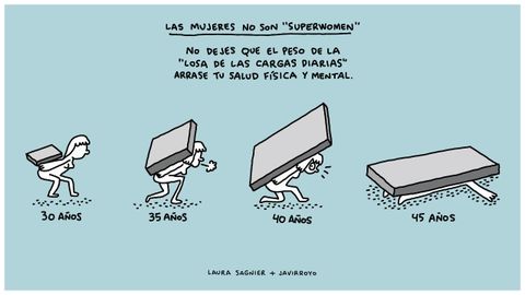 «La losa es algo que no vemos en las películas de Disney, ni siquiera en las más modernas, que hablan mucho de superwomen, de mujeres que salvan el mundo. ¡Cuando no se trata de salvar el mundo, sino de hacer lo que hay que hacer a diario en casa repartiendo la carga! En las películas ponen, por ejemplo, a la presidenta de un país que sale todos los días de su casa con su traje de chaqueta perfectamente planchado, con sus camisas de tintorería (¡porque eso que vemos no se lava en casa!)... Pero lo que está claro, y nunca nos enseñan, es que esa mujer tiene una ayuda de cámara. Me parece muy fake lo poco que se habla de todo lo que no se ve de esos temas de casa que afectan a todas las familias», sostiene. Es esta una losa que ilustra con facilidad y elocuencia Javirrojo, que al dibujar piensa.