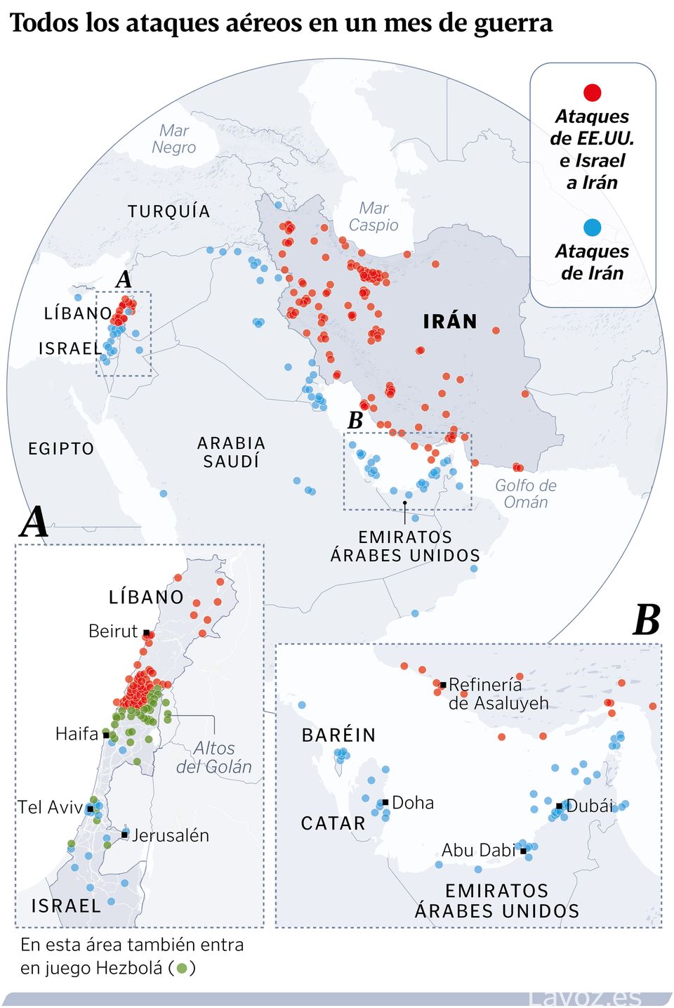 Resistencia inesperada. Con el inicio de la guerra, Hezbolá volvió a ponerse en pie de guerra en el sur del Líbano. Israel lanzó una ofensiva terrestre para ocupar dicho territorio aprovechando la presunta debilidad del grupo tras la guerra del 2024. No obstante, el Ejército hebreo ha encontrado una resistencia inesperada y está atascado en sus combates. No obstante, la aviación israelí sigue siendo muy superior y ha volado la práctica totalidad de los puentes que conectan la zona meridional del país de los cedros con el resto para impedir refuerzos y ha volado aldeas enteras para que los desplazados no regresen a sus hogares. Tel Aviv declaró abiertamente una ocupación del territorio que dejaría sin retorno a casi medio millón de libaneses.
