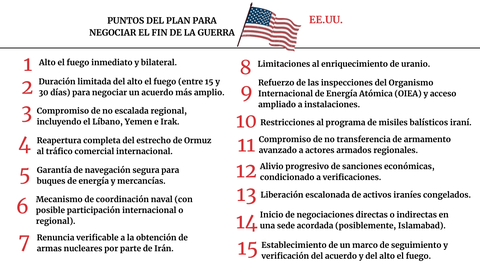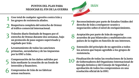 Tras el anuncio de tregua temporal de Trump, Teherán publicó una propuesta de 10 puntos sobre los que trabajar las conversaciones de paz, aunque dichas reivindicaciones ya habían sido filtradas a la prensa a lo largo de la guerra y defendidas públicamente por figuras de primera línea de la república islámica. En suma, el régimen de los ayatolás recogía en ellas el blindaje y la supervivencia del país y su economía. El decálogo recogía el cese de la guerra en su país y sobre las milicias afines a Teherán en Yemen, Palestina, Irak, y el Líbano. Incluía la reapertura del estrecho de Ormuz —la máxima exigencia de la Casa Blanca y la comunidad internacional—, pero con los peajes millonarios aprobados por el Parlamento durante la guerra, así como el fin de las sanciones económicas a la república islámica y el reconocimiento de EE.UU. y aliados del derecho a enriquecer uranio, siempre con supervisión y con opción a negociar el nivel de dicho enriquecimiento.