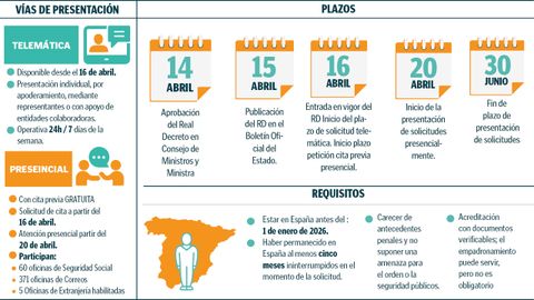 16 abr 2026 . Actualizado a las 16:54 h.El Gobierno aprobó este martes en el Consejo de Ministros el real decreto para la regularización extraordinaria de migrantes, que dará un permiso temporal de residencia y trabajo a medio millón de extranjeros que están en una situación irregular en España, abriéndoles la puerta a cotizar y a pagar impuestos. En Galicia, se prevé que inicien el proceso unas 20.000 personas. La norma se publicará el miércoles en el Boletín Oficial del Estado y entrará en vigor el jueves, cuando ya se podrán comenzar a tramitar las primeras solicitudes telemáticamente. La vía presencial no se abrirá hasta el lunes, 20 de abril, para lo que habrá que solicitar cita previa obligatoria, que se podrá pedir desde el miércoles a través del teléfono 060 o por internet.