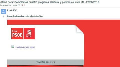 El correo del PSOE asturiano remitió un correo a toda sus cuentas de correo electrónico en el que anunciaba un cambio en el programa electoral