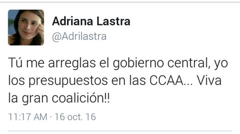 16 oct 2016 . Actualizado a las 12:34 h.La diputada socialista Adriana Lastra, cabeza de lista del PSOE por Asturias en las dos últimas elecciones generales y miembro de la dirección federal de Pedro Sánchez, dio por hecho esta mañana a través de varios mensajes en su cuenta de Twitter que la posible abstención de su partido en una nueva investidura de Rajoy en el Congreso sería a cambio de que el PP aprobara los presupuestos del Principado. Incluso llegó a publicar que un tweet en el que decía que «Tu me arreglas el gobierno central, yo los presupuestos de las CCAA... Viva la gran coalición!!», aunque lo borró apenas un minuto después.