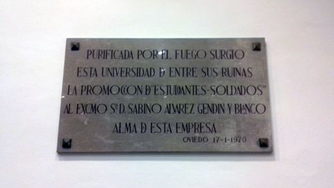 El más sencillo de eliminar y que cuenta con una apuesta clara para su supresión es una placa fijada en una de las paredes del Aula Magna y que recuerda al rector de la inmediata postguerra por parte de la «promoción de estudiantes soldados». Lo hace además con una «retórica» bélica y propia del régimen, según destacó Erice, que se refiere a la «purificación por el fuego». El catedrático resaltó además que se trata de una imagen instalada muy recientemente, en 1970, caso al final de la dictadura y cuya supresión no afectaría en modo alguno al edificio.