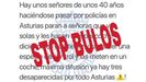 No se trata de la primera vez que esta clase de bulos corren como la pólvora en Asturias. El pasado marzo y con relación a las desapariciones de las tres mujeres asturianas, se difundía un mensaje en el que se alertaba de la presencia de falsos policías secuestrando mujeres. «¿Te ha llegado este mensaje? Ni caso, NO hay falsos policías secuestrando a mujeres. Si te llega este bulo, rompe la cadena y no crees alarma irreal. Confía en fuentes oficiales y no en información sin sentido», escribía la Policía Nacional en su muro de facebook.