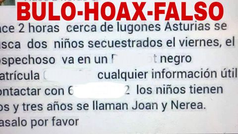 20 ago 2018 . Actualizado a las 18:58 h.SOS Desaparecidos difundía ayer en Twitter un mensaje en el que desmentían el bulo que se ha filtrado en las redes sociales referente al secuestro de dos niños en Lugones, Oviedo. «Ni en #Lugones - #Asturias ni en ninguna zona de #España, ni del mundo mundial, han secuestrado a Joan y Nerea #sosdesaparecidos #Missing #España #Bulo #Falso», reza el mensaje escrito por la organización y compartido por la Guardia Civil.
