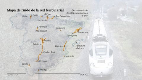 Si se echa un vistazo al mapa, se observa que aparecen Cantabria y El País Vasco, con servicios de cercanías en las zonas con mayores concentraciones de población urbana. No ocurre igual con Galicia, ausente en el mapa del ruido. A pesar de que las tres regiones que sí aparecen tienen conurbaciones de núcleos más extensas que las gallegas, su estructura territorial no sería tan diferente a las de las áreas metropolitanas de Vigo y A Coruña. Incluso aparece Mallorca, con una red ferroviaria muy limitada, o el eje entre Palencia y Valladolid. Además de las zonas más afectadas (Madrid y Barcelona), también están incluidos los entornos metropolitanos de Sevilla, Málaga, Alicante o Valencia.