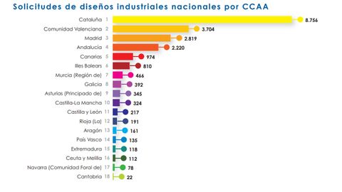 El único apartado en el informe de la Oficina de Patentes en el que Asturias no ocupa un puesto bajo es en el de solicitudes de diseños industriales. En este punto, el Principado aparece en noveno lugar, en un puesto intermedio en el conjunto de comunidades autónomas, con 345 solicitudes registradas a lo largo de 2017. El informe explica que un diseño industrial «otorga a su titular el derecho exclusivo sobre la apariencia de la totalidad o de una parte de un producto que se derive de las características de, en particular, las líneas, contornos, colores, forma, textura o materiales del producto en sí o de su ornamentación». La oficina de Patentes recibió el año pasado un total de solicitudes de 22.109 diseños industriales. En cuanto a las procedentes de residentes en las comunidades autónomas, la mayor actividad se registró en Cataluña (40,08%), Comunidad Valenciana (16,96%), Madrid (12,91%) y Andalucía (10,16%); sumando estos territorios más del 80%. Según se explica en el informe las clases que concentran un mayor número de diseños industriales nacionales concedidos y las que más actividad han tenido son: Artículos de Vestir y Mercería; Símbolos Gráficos, Logos, Motivos de Decoración, Ornamentación y Objetos de Adorno.
