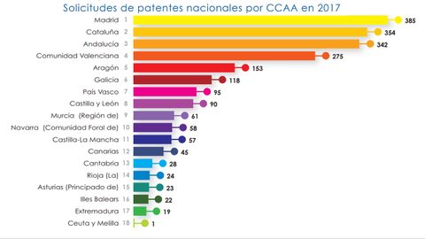 Esta situación se ha visto confirmada por el informe de Oficina Española de Patentes y Marcas O.A. (OEPM), correspondiente al año pasado, y en el que Asturias aparece a la cola de las comunidades en la estadísticas por territorios en cuento a solicitudes de patentes nacionales. El Principado está en puesto número 15 (con apenas 23 solicitudes) sólo por delante de Baleares, Extremadura, y las ciudades autónomas de Ceuta y Melilla. Según los datos del estudio, el número total de solicitudes de patentes nacionales presentadas por residentes en las comunidades el año pasado fue de 2.150. «Las solicitudes de patentes correspondientes a las comunidades autónomas muestran su mayor actividad en Madrid (17,91%), Cataluña (16,47%), Andalucía (15,91%) y Comunidad Valenciana (12,79%) que suponen el 63,07% de la totalidad de las solicitudes presentadas».