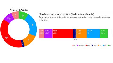 La proyección publicada este miércoles por comunidades indica que en Asturias hay un aumento al apoyo a los socialistas y un importante retroceso en el respaldo a Podemos, que bajaría de nueve a cuatro escaños. Izquierda Unida, que en esta legislatura logró un grupo parlamentario de cinco escaños perdería dos en el nuevo mandato. Foro bajaría de tres a un escaño, que sería en solitario para su candidata, la actual alcaldesa de Gijón, Carmen Moriyón; mientras que el PP --que afronta una situación de bicefalia tras apostar Génova por Teresa Mallada como candidata en detrimento de la presidenta regional, Mercedes Fernández-- también perdería respaldo y un escaño, pasando de once a diez.