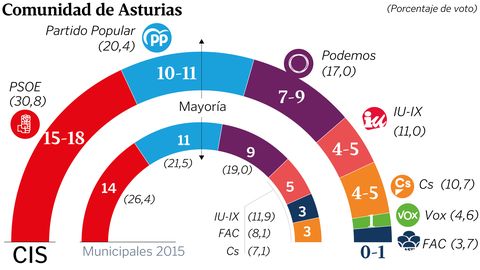 Así que hay que mirarse de reojo. Empezando por Adrián Barbón, el favorito en las encuestas, que navega a favor de corriente (la victoria de Sánchez, el peso histórico) y al que la última encuesta, realizada antes del 28-A, le otorga el triunfo (15-18 escaños). Dice Tezanos que este matiz temporal puede beneficiar a las fuerzas más votadas, por lo que Barbón saldría más consolidado. Junto con Podemos (7-9 diputados) e IU (4-5) sumaría una mayoría solvente de izquierdas, aunque Lorena Gil, candidata morada, tendrá la última palabra. ¿Será capaz de acordar la investidura de Barbón? Durante la última legislatura, la política de demolición socialista ha sido una constante podemita, con Dani Ripa al frente. Un resultado negativo, con pérdida de escaños, de Podemos daría la razón a un sector del partido que reclama ser más constructivo, es decir: alcanzar parcelas de poder para ser propositivo y no solo un martillo pilón. IU, en la etapa postllamazares, se juega su obstinada apuesta por caminar separada de Podemos. Y esta última encuesta les da la razón: la confluencia nacional que propugna Garzón resta votos en vez de sumar, toda una paradoja aritmética electoral para Ángela Vallina.