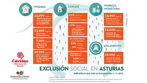 También indica que la dimensión en el ámbito asturiano que más afecta a la exclusión es la vivienda. «Afecta al 24% de toda la población y en mayor medida a los que están en exclusión y en exclusión severa, un 63% y 81,5% respectivamente. La inseguridad en la vivienda afecta a 18 000 familias y la inadecuación de la vivienda a 36 000».