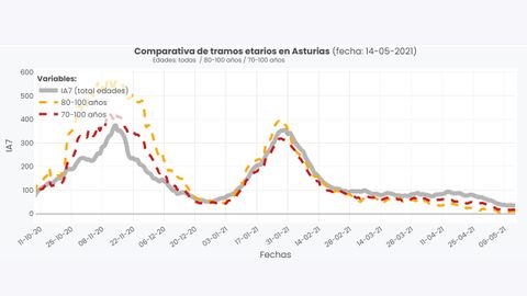 No ha fechas ni porcentajes mágicos porque todo esto tiene muy poco, más bien nada, que ver con la magia, y mucho con la ciencia; pero sí se puede señalar un momento y un intervalo, algo después de mediados de abril, pasado el día 19, cuando las tasas de vacunación de los mayores de 60 años, con una dosis, empiezan a pasar de la mitad del grupo etario. El efecto arranca en cascada y los contagios empiezan a bajar, la meseta ya no se sitúa en una media del centenar de positivos diarios sino de la mitad, medio centenar, y las altas hospitalarias empiezan a ser más que los ingresos. Con una diferencia respecto a las olas anteriores, y no menor, los pacientes que pasan a ocupar una cama en los hospitales de Asturias y los que tienen la desgracia de entrar en la UCI son más jóvenes y sus estancias son más prolongadas.