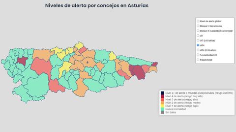 18 jun 2021 . Actualizado a las 05:00 h.La pandemia del coronavirus está controlada en Asturias. Todos los indicadores -contagios, hospitalizaciones y fallecimientos- se encuentran en los mejores niveles del año, pero existen diferencias importantes por concejos. La inmensa mayoría está en lo que se conoce como nueva normalidad en cuanto a incidencia a 14 días por cada 100.000 habitantes (IA14), pero hay cinco en los que el nivel de riesgo es muy alto (nivel 5 de los 6 que hay en el Principado si se cuenta el 4+).