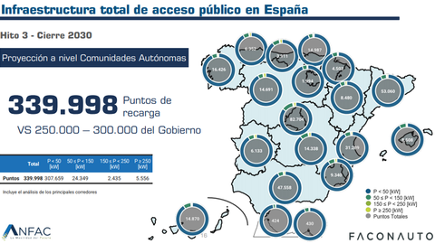 Para cubrir la demanda de recarga del parque electrificado, Asturias cuenta en estos momentos con 224 puntos de abastecimiento públicos, la mayoría concentrados en las grandes ciudades. Con la metodología elaborada por el sector de la automoción, las patronales Anfac (fabricantes) y Faconauto (concesionarios) aseguran que en el 2023 Asturias tendría que tener operativos 1.272 recargadores, que serían 2.041 en el 2025 y 6.352 en el 2030 (año en el que se quieren alcanzar las 340.000 en todo el país). En la actualidad, los puntos de recarga en España son solo 11.517 y el 80% de ellos con la tecnología de recarga más lenta. Es decir, que en apenas una década, Asturias debería incrementar exponencialmente su potencia de recargadores y pasar de los 224 puntos actuales a más de 6.000 y multiplicar la actual cifra por 30.