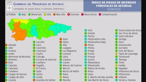 14 ago 2021 . Actualizado a las 13:15 h.Nueve de los 78 municipios asturianos tendrán este domingo un índice de incendios forestales «muy alto». Se trata de Allande, Boal, Cangas del Narcea, Degaña, Grandas de Salime, Ibias, Illano, Pesoz y Villayón.