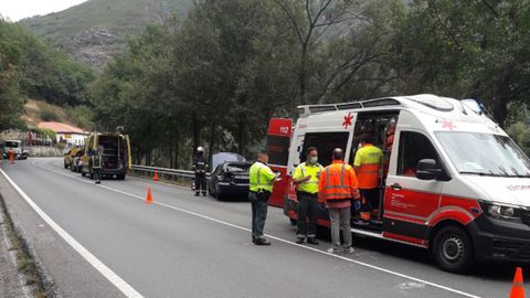 El hombre que viajaba en el asiento delantero del vehículo tuvo que ser excarcelado del interior del turismo por efectivos de Bomberos del Servicio de Emergencias del Principado de Asturias (SEPA) con base en el parque de Cangas del Narcea.