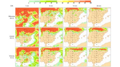 Se registrarán nevadas copiosas en el entorno de los Pirineos, cordillera Cantábrica y sistemas Central e Ibérico, pudiendo acumularse más de 10-15 centímetros de nieve en veinticuatro horas en estos sistemas montañosos, con cotas además bastante bajas en torno a unos 500-700 metros en el extremo norte y en torno a los 600-800 en el resto del norte y centro peninsular, por lo que podría nevar de forma débil en algunos puntos de la meseta y en páramos de la zona centro.