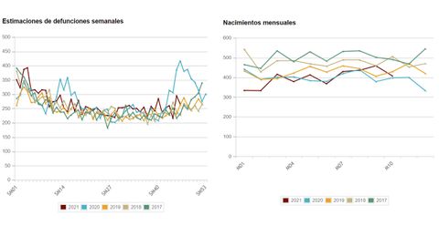 El INE también ha recogido las cifras de fallecidos, el balance, no por conocido, es menos terrorífico sobre el impacto singularmente de la segunda ola el invierno pasado en Asturias; pero también una pequeña luz de esperanza sobre el efecto de las vacunas ya que el registro de muertes en lo que va de 2021 es muy similar, mes a mes, al de un año habitual anterior a la pandemia. Así se aprecia un primer pico de fallecidos en la primavera de 2020, en marzo y abril, aunque los valores llegaron incluso a ser menores de lo habitual en el verano. Sólo fue una tregua, hace un año, en los meses de otoño, las muertes por covid alcanzaron su pico más alto, hasta 417 personas en la primera semana de noviembre. En lo que va de 2021 se han registrado dos picos concretos y muy cercanos, en la primera semana de octubre y la del pasado noviembre pero no demasiado alejadas de las estadísticas de años prepandemia.