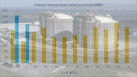 El consumo de gas natural en Asturias ha experimentado un incremento relevante en los últimos años. Así, en 2018 el consumo global de este recurso en la comunidad fue de 8.811,0 gigavatios-hora (GWh), fue la última ocasión en la que el registro estuvo por debajo de los 10.000. El año siguiente, en 2019 fue de 11.813,0; en el 2020 (el año marcado por la pandemia) se incrementó a los 12.254,0; y al término de 2021 el registro total fue de 12.854,0 GWh.
