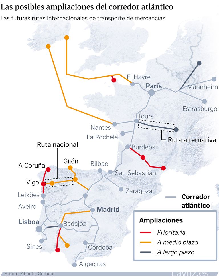 El informe asume que estas extensiones tienen como objetivo conectar el corredor con los principales puertos de Galicia y Asturias, pero frente a lo que ya ha sido aceptado en la Red Transeuropea de Transporte, el consorcio Atlantic Corridor da más relevancia a la conexión entre Galicia y Portugal, que no se incluyó en las ampliaciones decididas en el 2019 y que con toda probabilidad entrará en la siguiente tanda de prolongaciones, una prueba más de la escasa sincronización entre las iniciativas comunitarias relativas a la infraestructuras y las que se ocupan más específicamente de los servicios ferroviarios.