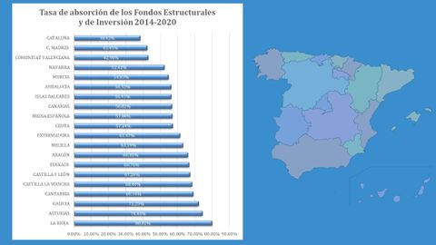 Pero no todos los territorios en España se encuentran en la misma situación. Asturias, La Rioja y Galicia superan porcentajes de ejecución del 70% y se encuentran 15 puntos por encima de la media del país, el informe advierte de que el cumplimiento urge porque tiene fecha de caducidad: «el plazo para absorber los fondos finaliza el 31 de diciembre de este año». El informe señala además que en el vagón de cola del país, arrastrando la tasa de cumplimiento del conjunto se encuentran Cataluña, Madrid y la Comunidad Valenciana, con tasas que no llegan al 50%. Esta tasa es el cálculo global de la ejecución de tres bloques: el Fondo Europeo Agrícola de Desarrollo Rural (FEADER), el Fondo Europeo de Desarrollo Regional (FEDER) y el Fondo Social Europeo (FSE).