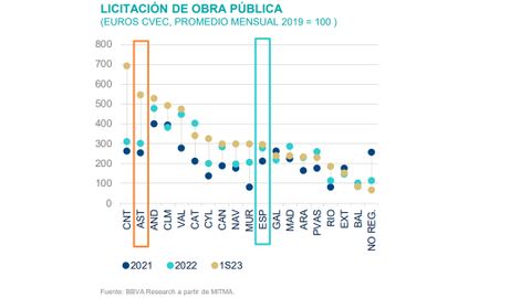 24 sep 2023 . Actualizado a las 05:00 h.Asturias se ha situado en lo que va de 2023 entre las comunidades a la cabeza en la licitación de obra pública, ocupando el segundo lugar tras Cantabria, y este ha sido uno de los factores que ha permitido potenciar el crecimiento de la economía regional. Es uno de los datos revelados en el informe para la comunidad de BBVA y que augura que cierre el año ya habiendo recuperado el PIB previo a la pandemia y se consiga incluso un crecimiento superior a la media del conjunto del país el año próximo.