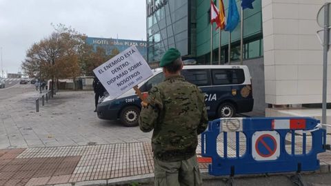 En las protestas hubo insultos, los habituales en las concentraciones de estos días, contra el presidente en funciones, también muchas banderas de España usadas como capa y un partícipe singular. Uno que asegura ser militar en activo y que lució carteles alusivos a la Guerra Civil, en concreto respecto al episodio del bombardeo del cuartel de Simancas en Gijón en 1936.