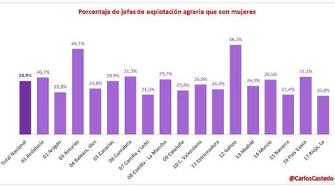 Las cifras han sido recopiladas por Carlos Castedo a partir de la Encuesta sobre Estructuras Agrarias publicada por el INE. De ella se desprende que Asturias y Galicias son las comunidades en las que, y de forma muy destacada respecto al resto, hay más mujeres al frente de propiedades agrárias. En el Principado son el 46% y en Galicia el 48%. Ningún otro territorio llega a porcentajes similares.