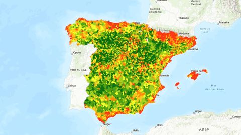 Llama la atención el mapa resultante de poner en relación el número de viviendas turísticas sobre el total de las viviendas censadas en los municipios del entorno de los Picos de Europa, ya que lo que se dibuja es una gran zona roja cuya leyenda indica que hay municipios en los que entre el 4% y el 7% de las viviendas censadas tienen uso turístico, algo que se generaliza a la mayor parte de los concejos de la zona oriental de la región.