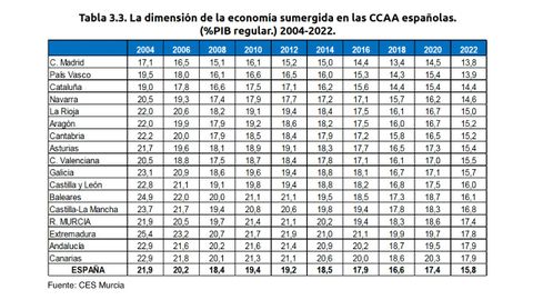 Del estudio del CES de Murcia, que, aunque analiza más en profundidad la economía de dicha región, ofrece datos de las diferentes comunidades, se desprende que el porcentaje de dinero «negro» que se mueve en Asturias es ligeramente inferior a la media nacional. En concreto, si esa media estatal la cifra en 2022 en el 15,8%, la de Asturias era del 15,4% que, cabe reseñar, es el porcentaje más bajo en casi dos décadas. No obstante, en el caso del Principado, el descenso de la economía sumergida no fue constante desde el año 2004, ya que el documento recoge repuntes en los años 2010 y 2012 al 18,9% y al 19,1%, respectivamente, cuando en 2008 el porcentaje de dinero «negro» había descendido al 18,1%. Si bien a partir de 2012 la curva de la economía sumergida continuó bajando y llegó al 16,5% en 2018, en 2020, año de pandemia, el porcentaje volvió a crecer hasta el 17,3%.
