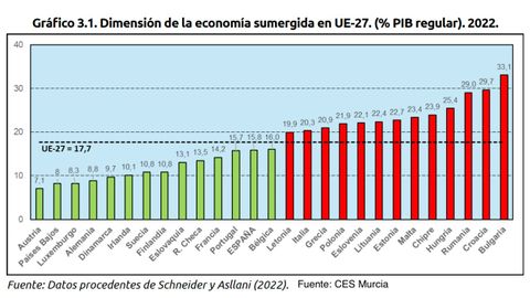 14 jun 2025 . Actualizado a las 05:00 h.La economía sumergida en Asturias sigue siendo un tema de gran relevancia para entender la realidad económica de la región. En 2022, según un estudio del Consejo Económico y Social (CES) de Murcia, esta economía no oficial representó aproximadamente el 15,4% del Producto Interno Bruto (PIB) de la región, lo que equivale a unos 3.976 millones de euros si se tiene en cuenta que el PIB de ese año fue de 25.822 millones de euros. Aunque esos casi 4.000 millones de euros es una cifra significativa, el análisis en términos porcentuales muestra una tendencia a la baja en comparación con años anteriores.
