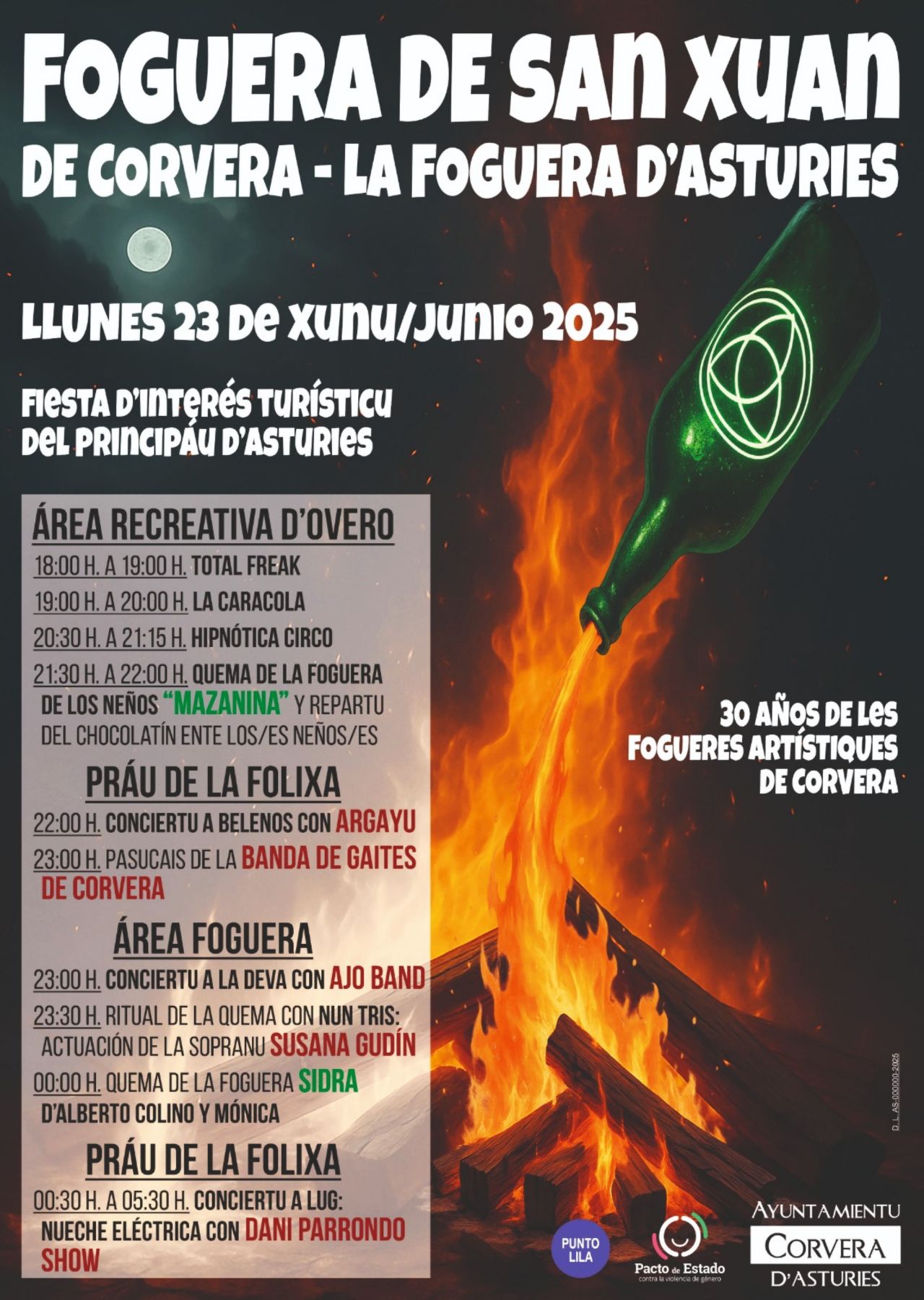 A las 22:00 horas, comienza la noche musical con el concierto de Argayu, una de las formaciones musicales de Corvera con más proyección en el Prao. A las 23:00 horas, la Banda de Gaitas de Corvera hará un pasacalle por el área festiva. También a las 23:00 horas comenzará el concierto de Ajo Band, uno de los artistas asturianos fundamental en la creación del nuevo folk, en el área de la Foguera. A las 23:30 horas se da inicio al ritual de la quema que protagonizará el grupo de teatro Nun Tris y la actuación de Susana Gudín, una de las más reconocidas sopranos asturianas, y a medianoche se producirá el encendido de de La Foguera principal “Sidra”, diseñada igualmente por Alberto Colino y Mónica Álvarez. De la pira surgirá una gran botella de sidra inclinad, de la que saldrá un hilo de plata que caerá en un vaso sidrero.