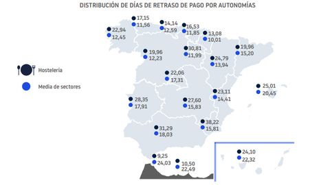 El informe destaca además que los pagos puntuales en hostelería representan un 37,63 %, frente al 44,18 % registrado de media en el resto de sectores. También se observa una variación significativa de ese retraso entre comunidades autónomas, siendo Murcia la región con mayor retraso y Ceuta la que registra el menor, con una diferencia de hasta 28,97 días.