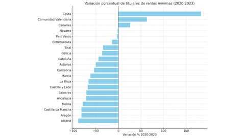 Entre 2020 y 2023 se ha pasado de 394.436 a 258.568 personas beneficiarias de rentas mínimas (34 % menos), aunque con notables diferencias entre comunidades, como muestra la caída del 89 % en Madrid o del 82 % en Castilla-La Mancha, frente al aumento del 63 % en la Comunidad Valenciana o del 26 % en Canarias.