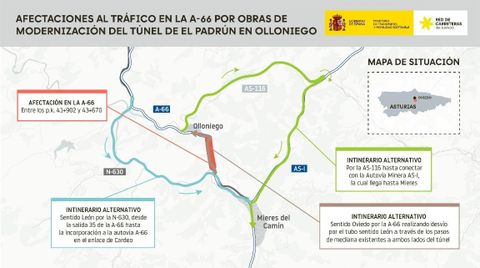 Para evitar problemas de tráfico, se han habilitado itinerarios alternativos señalizados: En sentido Oviedo, el tráfico se desviará entre los kilómetros 41 y 43 por el tubo sentido León, usando pasos de mediana en ambos lados del túnel.