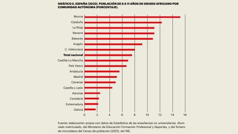 En su diferencia considera que el alumnado de origen africano sería «ejemplo de una distancia cultural considerable»; pero las características de la inmigración en Asturias ya hacen que sea mucho más predominante el origen americano y, de hecho, en la tabla estadística que incluye el informe,sobre población de 6 a 11 años de origen africano por comunidad autónoma, el Principado aparece en la parte más baja, con apenas algo más del 2%.