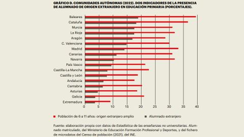 Según este cálculo, Asturias en el presente, (con datos correspondientes a 2021) tendría menos de un 5% de alumnado inmigrante, uno de los porcentajes del país, pero se dispararía hasta cerca del 20% contando de forma extensa en esos estudiantes de segunda generación. En concreto el autor destaca que «quizá más chocante es que en algunas comunidades autónomas con poco o muy poco alumnado extranjero, sin embargo, la proporción de origen extranjero en sentido amplio puede llegar a acercarse al 20% o superarlo, como en Galicia (21%), Asturias (18,6%), Cantabria (20,3%) o Castilla-La Mancha (22,7%)».