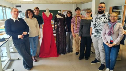 La fuente de esos conocimientos sobre el oficio y de los consejos prácticos sobre la vida real en una empresa del sector es Charo Carbajal, la profesora formadora. Lleva toda la vida ligada al sector de la confección y casi 30 años ayudando a otras personas a adquirir la destreza para trabajar en él. Ha sido trabajadora por cuenta ajena, ha hecho arreglos y ha puesto en marcha una pequeña empresa propia. Lo que intenta es transmitir a sus alumnos toda esa experiencia. «Este es un momento de relevo generacional y las empresas están demandando nuevos trabajadores para reemplazar a quienes se jubilan. Hay puestos por cubrir. Lo que aquí hacemos es aprender trabajando para estar preparados cuando llegue ese momento. Los alumnos deben ser muy conscientes de que en un taller de confección se trabaja en equipo. Si alguien se atasca, paraliza todo. Así que hay que estar bien preparado para hacer las cosas bien y con rapidez. Vamos muy a lo real y a lo práctico», cuenta sobre su método mientras supervisa el avance de un vestido que Carla se prueba mientras sus compañeros toman nota de los ajustes que necesita.