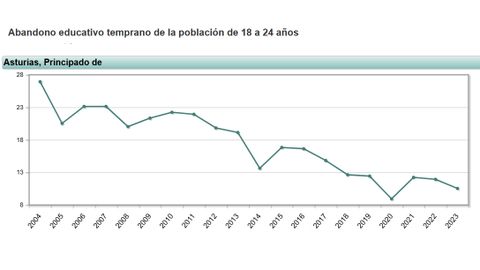 En Asturias la evolución a lo largo de las dos últimas décadas ha sido especialmente positiva. Los datos del INE, que recogen las cifras desde el año 2004 hasta 2023, reflejan que a comienzos del siglo eran un tercio de los alumnos asturianos los que no llegaban a completar las etapas obligatorias de educación, tras la Gran Recesión, y especialmente desde el año 2011, ese porcentaje empezó a disminuir de forma constante hasta porcentajes alrededor del 10% en el presente.