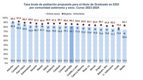 En el curso 23/24 Asturias registró la tasa bruta de graduación en la ESO más alta de España, con un 89,9%, según los últimos datos disponibles. La tasa de graduación fue del 90,3% en el caso de las mujeres y del 89,4% entre los hombres, lo que supone una diferencia de 0,9 puntos porcentuales. Esta es la menor brecha por sexo entre todas las comunidades autónomas en este nivel educativo. Debe tenerse en cuenta que para el conjunto del Estado, en los primeros años de implantación de la ESO, a comienzos del siglo, antes de la Gran Recesión, la diferencia de género se situaba en torno a los 15 puntos.