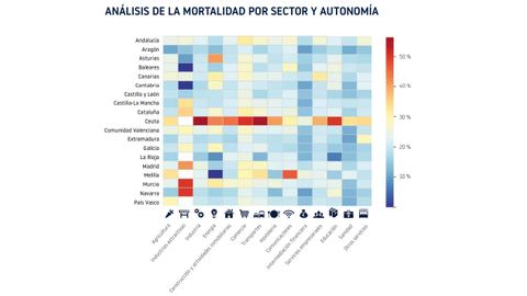 Desde el punto de vista territorial, Madrid, Cataluña, Andalucía y la Comunidad Valenciana concentran el mayor número absoluto de empresas inactivas. En términos relativos, las tasas de mortalidad más elevadas se localizan en Melilla, con un 37,61 %, Ceuta, con un 27,88 %, y Andalucía, con un 25,36 %. Por sectores, el mayor volumen de bajas corresponde al comercio, la construcción y los servicios empresariales, mientras que las tasas de mortalidad más altas se observan en el textil (31,71 %), el comercio al por mayor (30,30 %) y las industrias extractivas (29,30 %).