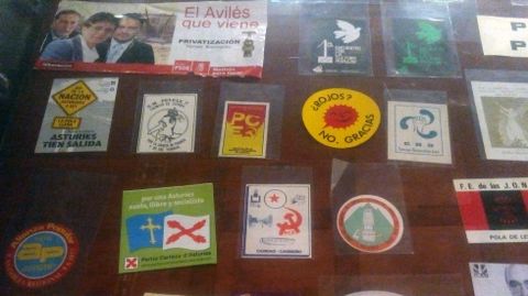 En su colección hay una amplia presencia de pegatinas relacionadas con Avilés, ya sea con acciones políticas, ecologistas, sindicales, incluso movimientos en los barrios.«De Avilés me deben faltar 10 ó 12», asegura. Algunas de ellas están presentes en la exposición que puede visitarse hasta el 13 de enero. Para poder llegar hasta aquí las somete a un cuidado proceso de conservación que pasa por introducirlas en pequeñas bolsas de papel cristal, de modo que «el pegamento no coma la pegatina». Las bolsas las guarda en álbumes y estos a su vez en cajas antihumedad que coloca en baldas en lo que él califica como «zulo», y es una parte del garaje de su casa de Meres. Ahí permanecen a una temperatura de seis grados. Todas las precauciones para evitar que se deterioren y algunas de las que cuentan con 40 años permanezcan como el primer día son pocas. De hecho, la calidad de las antiguas es mejor que la de las actuales, por la propia calidad de la tinta y el adhesivo, según aseguran los pegatineros.