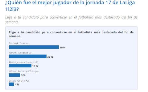 El murciano se impuso con un 40% de los votos a Álvaro Jiménez (2 goles en el Getafe 2-0 Sevilla Atlético), Pedraza (1 gol en la remontada del Lugo en Murcia), Kieszek (gran actuación del portero polaco en la victoria del Córdoba en Reus) y Longo (un gol en la victoria del Girona frente al Levante).