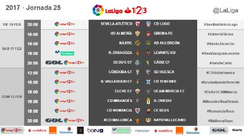 10 ene 2017 . Actualizado a las 17:27 h.Esta mañana se dieron a conocer los horarios y televisiones de la Jornada 25 de LaLiga 123. Jornada en la que el Real Oviedo visitará al Mirandés el domingo 12 de febrero a las 18.00 horas. Sin duda alguna, el enfrentamiento entre ovetenses y burgaleses será uno de los encuentros de la jornada. Actualmente les separan seis puestos y cuatro puntos después de que el equipo rojillo realizase un irregular inicio liguero, siendo el club que marca los puestos de descenso. A pesar de ello, la igualdad de la categoría y las malas experiencias del Oviedo en las últimas jornadas hacen que sea un partido trampa en un campo incómodo.