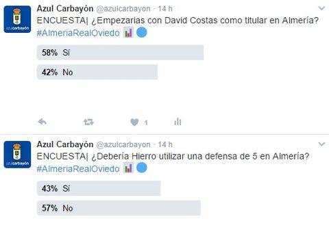 Con estas premisas lanzamos una encuesta a través de la cuenta de Twitter de Azul Carbayón. Los votantes decidieron con unos ajustados resultados que lo idóneo sería continuar con la defensa de cuatro hombres (57%) y que le darían una oportunidad a David Costas (58%).