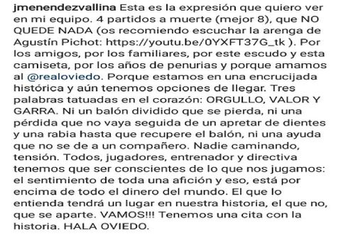 15 may 2017 . Actualizado a las 21:26 h.El presidente carbayón, Jorge Menéndez Vallina, ha vuelto a utilizar su cuenta en la red social Instagram para comunicarse con la afición azul. El dirigente ha utilizado una foto de la celebración del jugador del filial Edu Cortina tras su gol en Mareo y la ha acompañado de un mensaje motivador en el que apela al Orgullo, Valor y Garra, lema del club oviedista, y poner así su granito de arena en el objetivo de conseguir meterse en el playoff de ascenso a Primera División.
