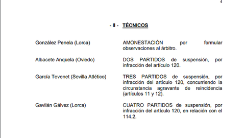 07 mar 2018 . Actualizado a las 16:31 h.La Real Federación Española de Fútbol (RFEF) ha hecho público los acuerdos del comité de competición y se confirma la locura: Juan Antonio Anquela ha sido sancionado con dos encuentros por la expulsión que sufrió en el encuentro del pasado viernes ante el Fútbol Club Barcelona B.