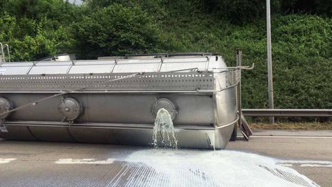 27 jun 2018 . Actualizado a las 18:21 h.Un camión cisterna cargado con leche ha volcado a la altura del kilómetro 386 de la A8, la autovía del Cantábrico, derramando buena parte de su contenido a la calzada. Aunque el incidente no ha afectado al tráfico algunos conductores se han detenido a ver la curiosa instantánea.