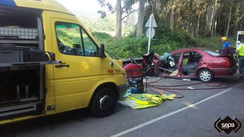 El Centro de Coordinación de Emergencias recibió el aviso a las 9:53 horas. En la llamada se indicó que se había producido una colisión entre un turismo y una grúa y dentro del coche había una persona atrapada. De inmediato se movilizó a 3 efectivos de Bomberos del Servicio de Emergencias del Principado de Asturias (SEPA), con base en el parque de Pravia, que se trasladaron con el furgón multisocorro. Una vez en el lugar, comprobaron que el conductor del turismo estaba atrapado por las piernas. Los sanitarios ya le estaban atendiendo y le habían colocado el collarín.