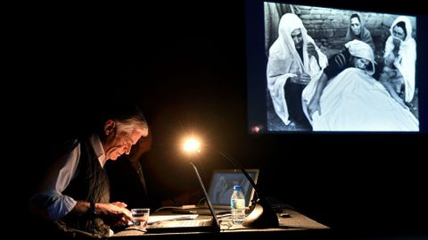 No tardaron en aparecer los primeros guiños a España en el discurso del camarógrafo. «Yo lo vi y así sucedió» es una de las frases citadas, acuñada por Francisco de Goya, del que Nachtwey se ha declarado y reconocido y como acérrimo fan y que definió como el «padre de los fotógrafos de guerra». El acto comenzó con un discurso del maestro, siempre preocupado por las historias que suceden ante sus ojos «en tiempo real» -ademas de la Historia en general, la cual descubrió «gracias a la fotografía»-, que quiso comenzar de una manera ilustrativa, como su profesión: las luces se apagaron y una muestra de su trabajo en el asedio de Kabul en el año 1996 comenzó a impactar en las retinas y conciencias de los asistentes. «Empecé a acompañar a los muyahidines en la guerra de Afganistán, una guerra que mutó y pasó a ser un asunto de los talibán», relata el fotógrafo. Kabul, en un principio ciudad apenas afectada por las contiendas de la Guerra Fría, se convirtió en una de las zonas más damnificadas. La capital del país fue donde, finalmente, la guerra se desató con toda su crudeza, transformándose de la noche a la mañana «en un paisaje lunar» que confundía la conciencia del artista de la imagen. «No puede ser que la gente sufra así. EEUU le debe algo a esta gente», reflexionaba James Nachtwey durante su estancia en Afaganistán de manera «inocente», tal como él define. Años más tarde fue consciente: «fue el último escenario bélico del siglo XX, el cual dio origen a aquellos del siglo XXI», dejando un panorama abierto que desembocó en el atentado del 11-S, el cual él vivió en primera persona.
